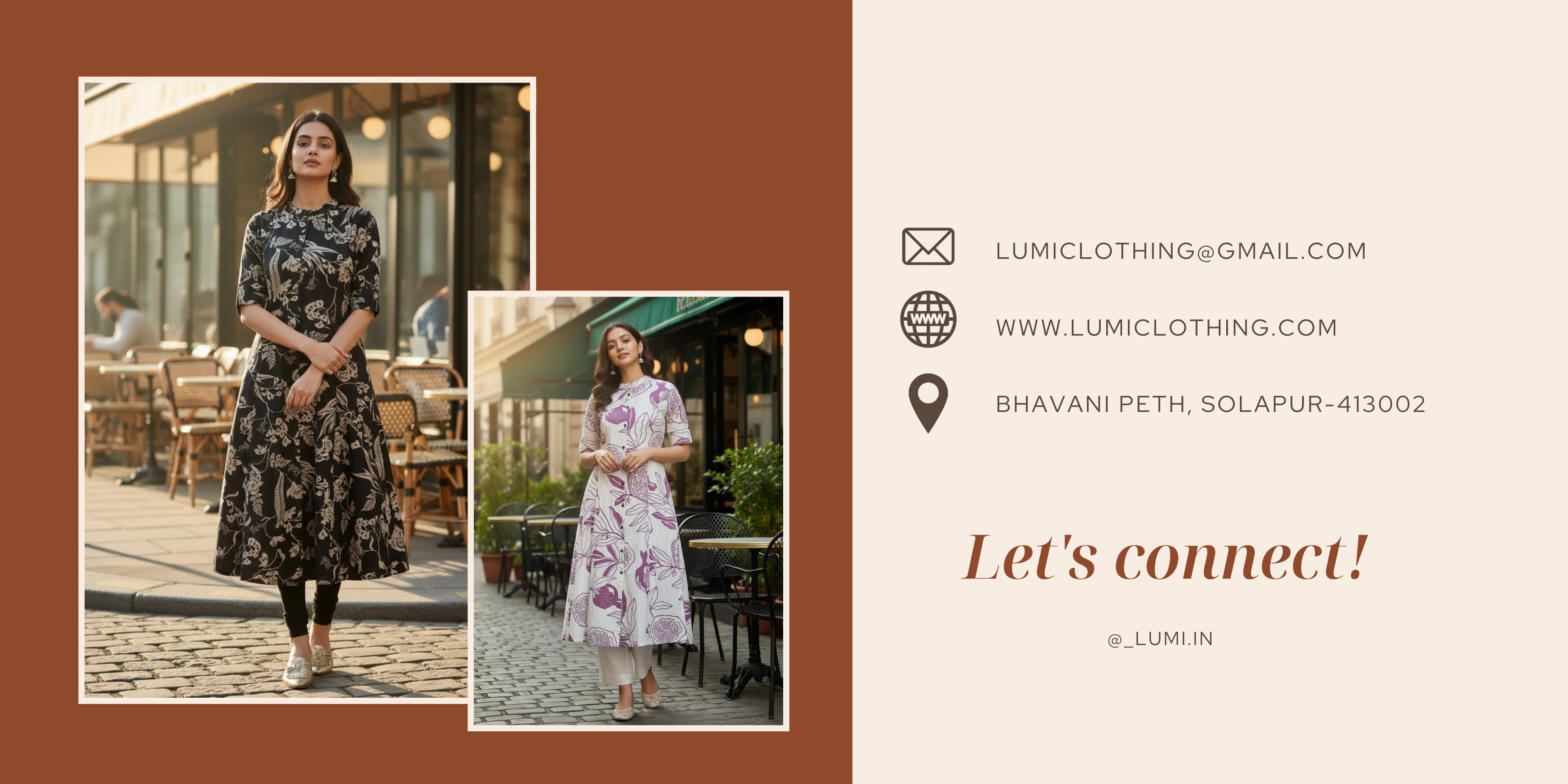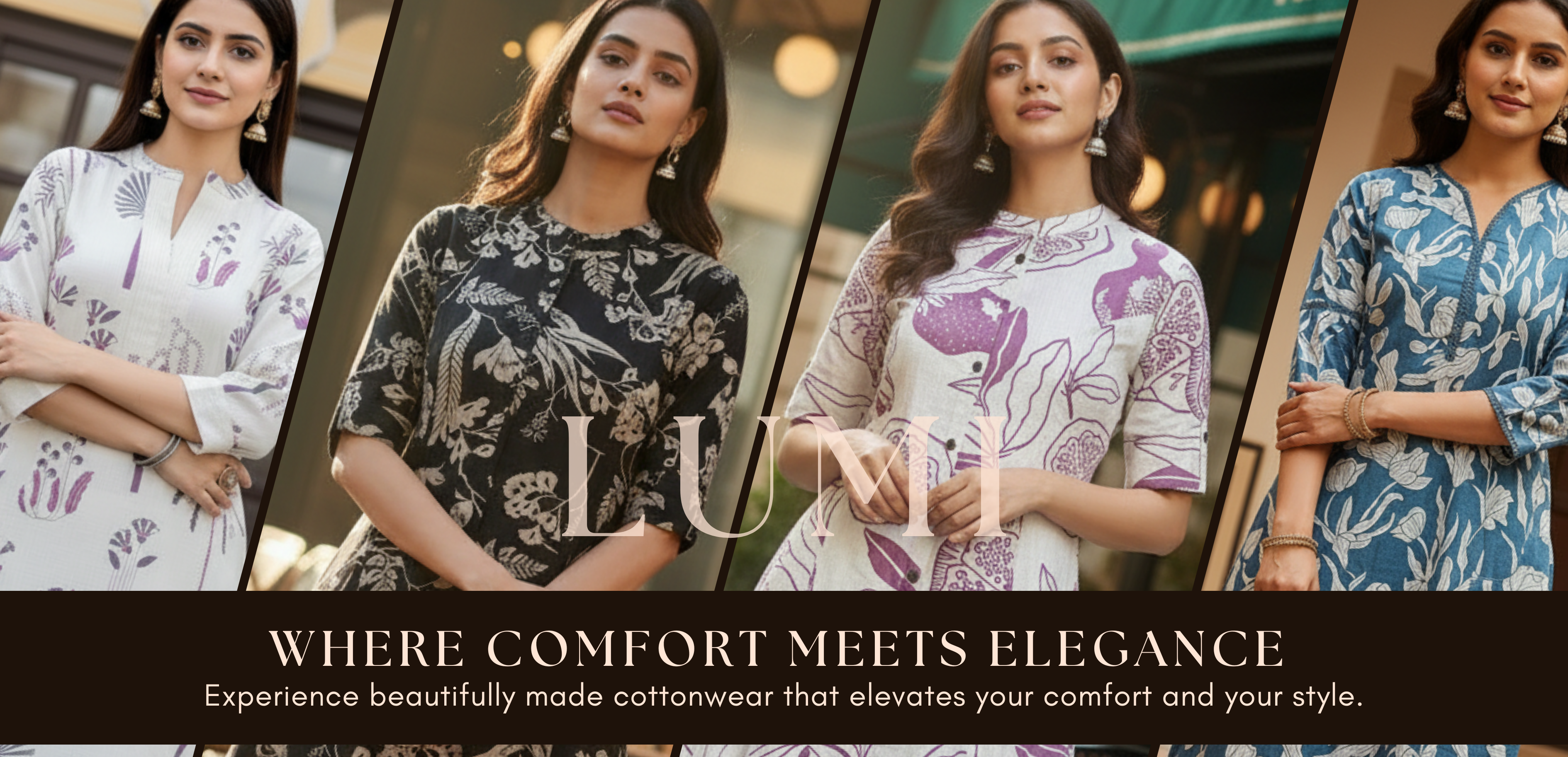 LUMI began with a desire to bring back what clothing should feel like — pure, breathable, and beautifully simple. In a world full of fast trends, we create garments that feel grounded, warm, and real.Every piece at LUMI starts with natural cotton: soft on the skin, gentle across seasons, and woven with a sense of ease. Our designs blend traditional Indian textures with modern minimalism, creating silhouettes that feel effortless yet refined.Whether it’s a thoughtfully tailored kurti, a coordinated set, a three-piece ensemble, or an elegant sari, our focus remains the same — to celebrate the everyday woman who chooses comfort without compromising style.LUMI is more than clothing.It is a feeling of purity, calm, and quiet confidence.